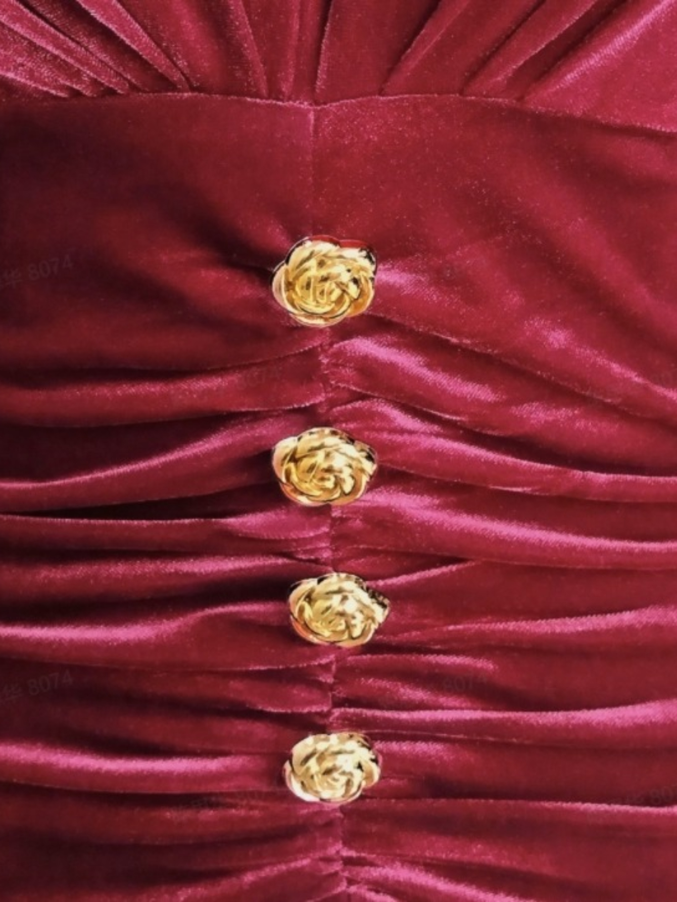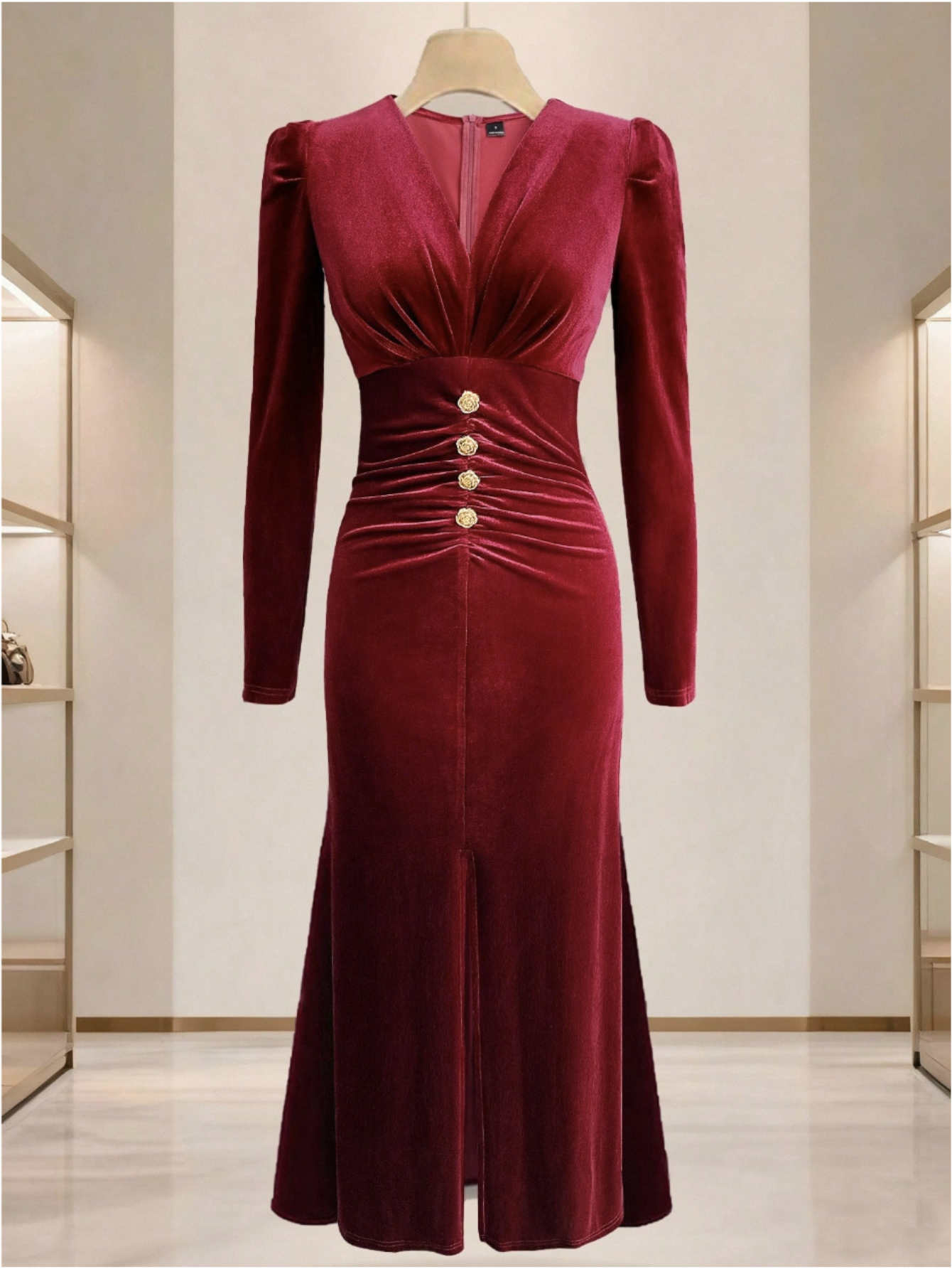 Burgundy/Deeper Red (Maroon) Button-Front Slit & Pleated Waist Dress - Elegant Winter Wedding Guest Gown, Party Evening Dress for Fall/Winter, Hand Washable Solid Color Formal Attire