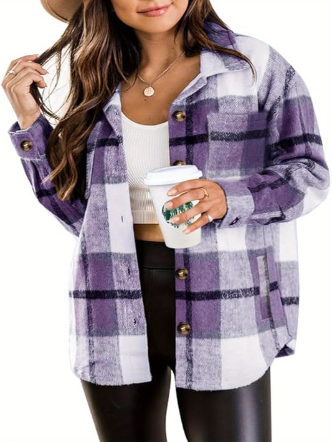 [Plaid Shacket] Plaid Shacket - Women's Long Sleeve Button Overshirt W/ Mid-Weight Warmth | Fall Layering Staple For Work, Weekend & Date Nights