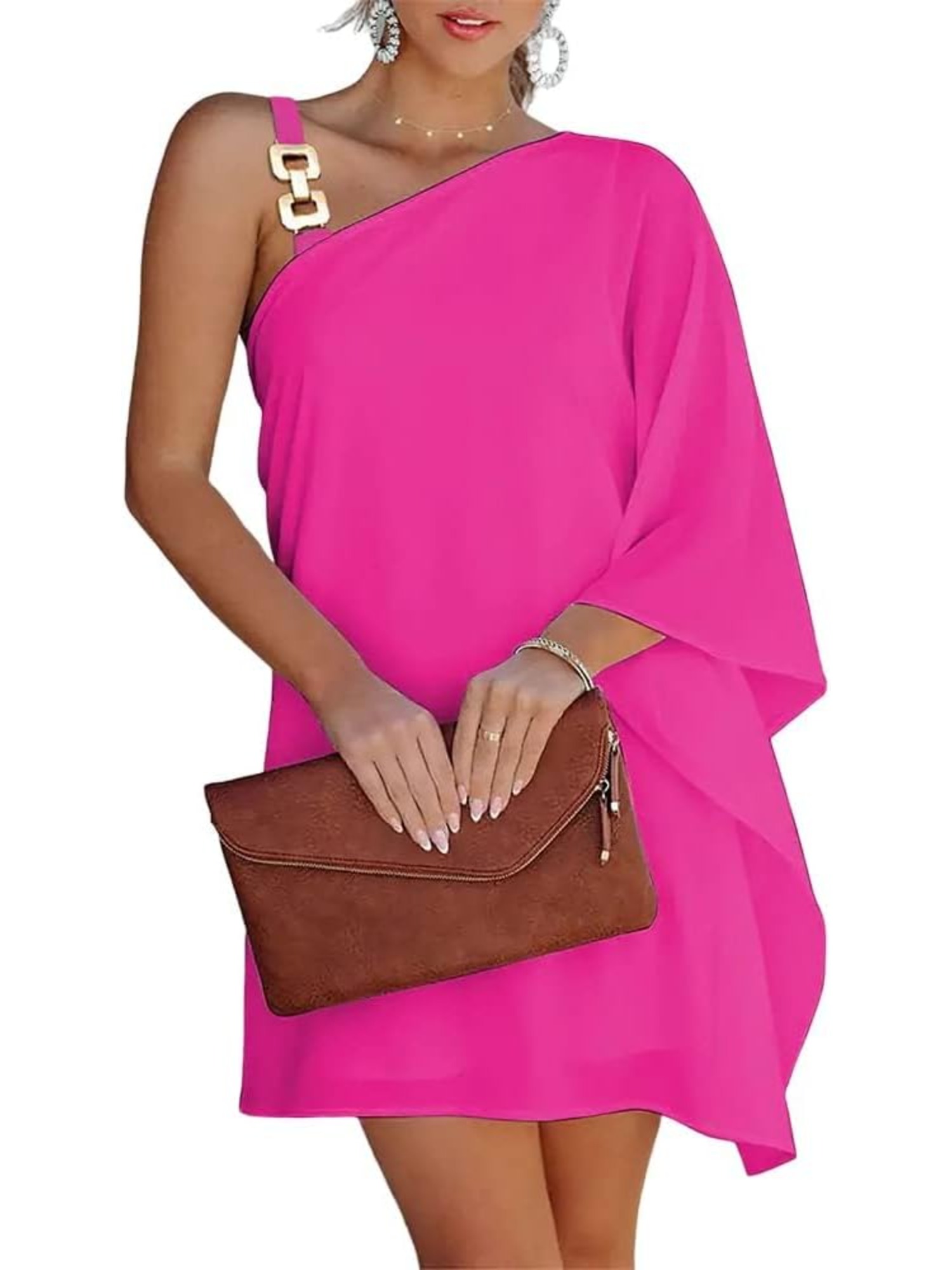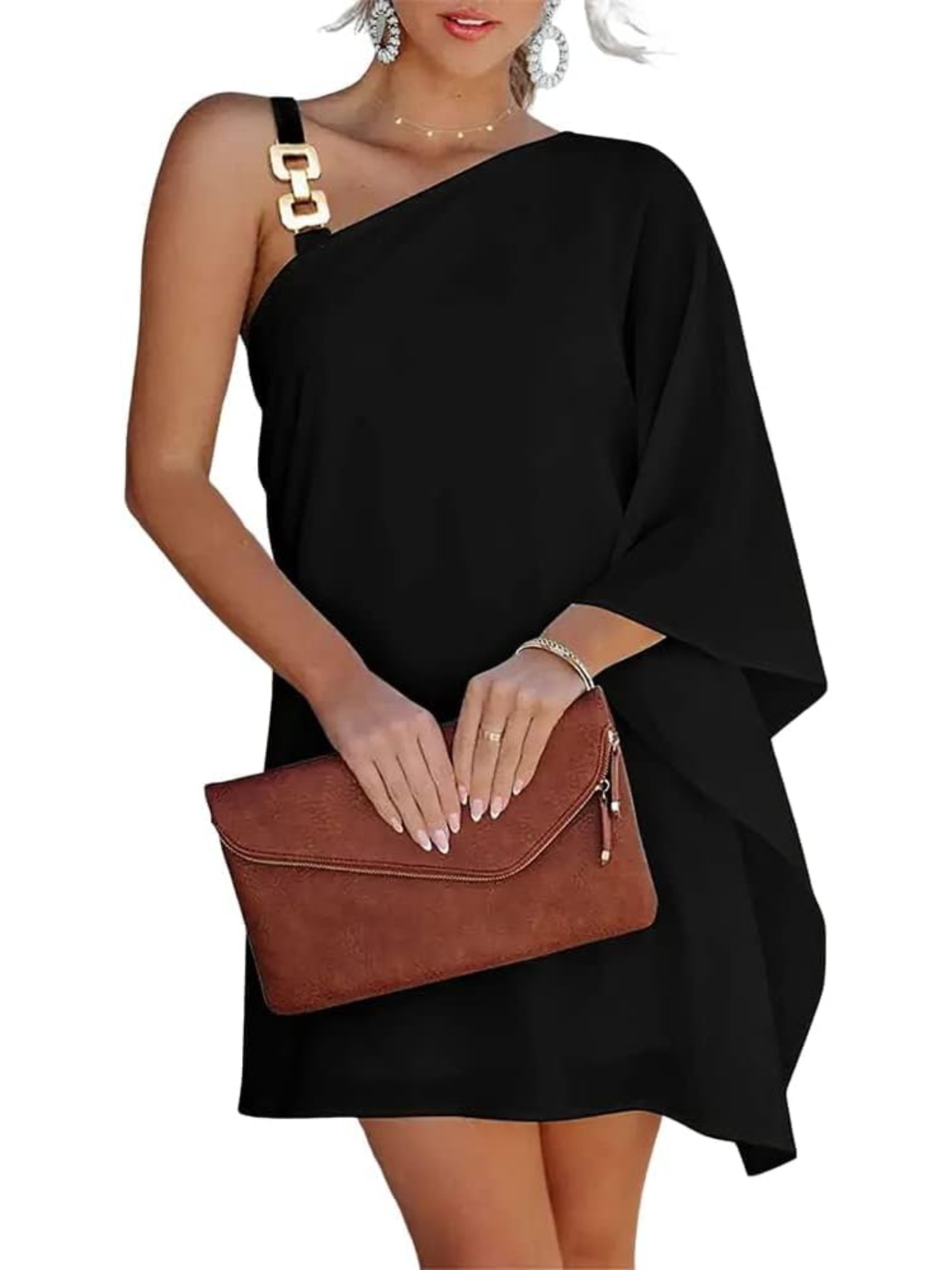 Women'S Elegant One Shoulder Black Midi Dress with Batwing Sleeves & Chain Accent - Boho to Semi-Formal Fitted Top & Flowy Skirt, Asymmetrical Hem, No - Fall/Winter Party Wedding Semi-Formal Attire (No Bra Padding, Natural Silhouette)