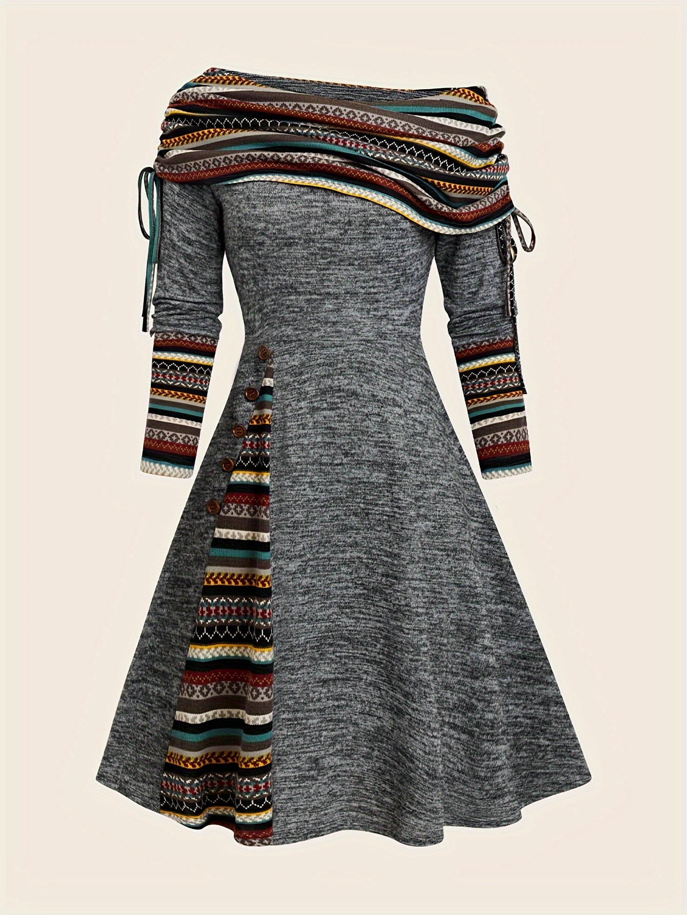 Contrast Striped Drawstring Smocked Dress, Chic Long Sleeve Dress For Spring & Fall, Women's Clothing