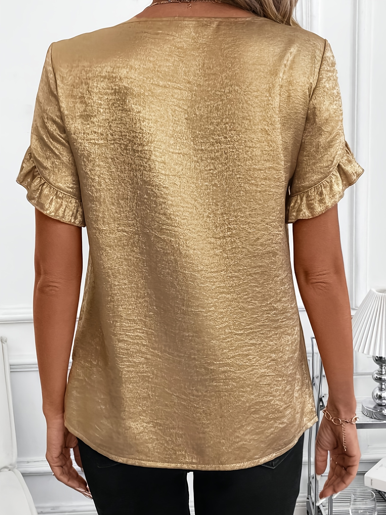 [Elegant Blouse] Elegant Golden Foil Women's Blouse | Round Neck Short Sleeve Summer Shirt, Machine Washable Solid Color Top for Casual & Formal Occasions, Ruched Shoulder Design, Lightweight Fabric