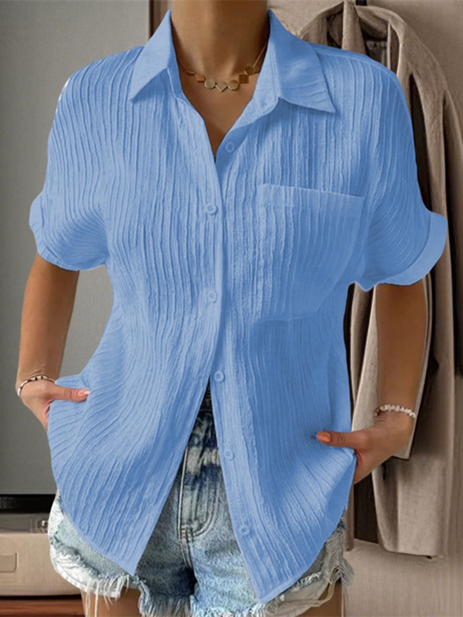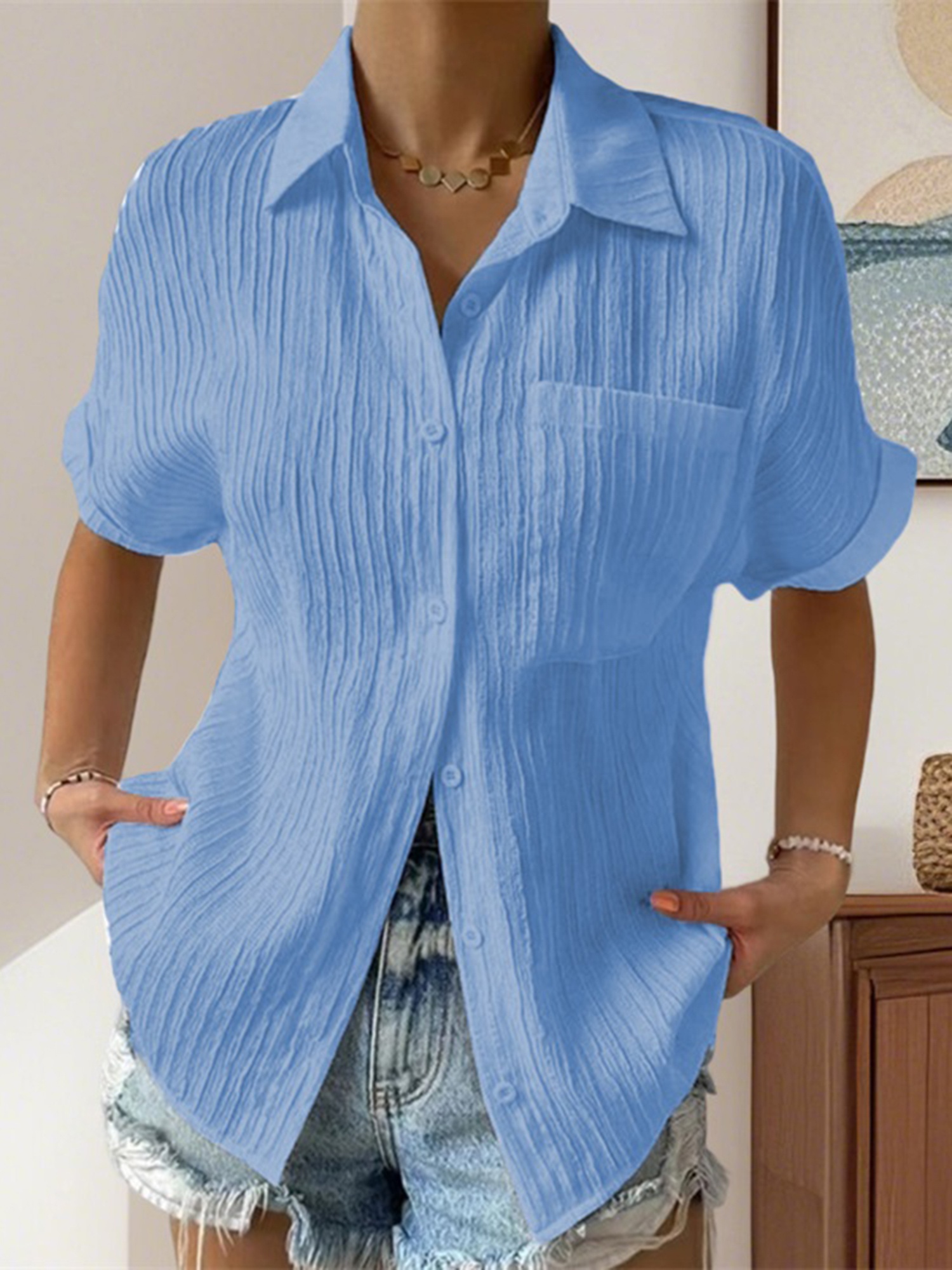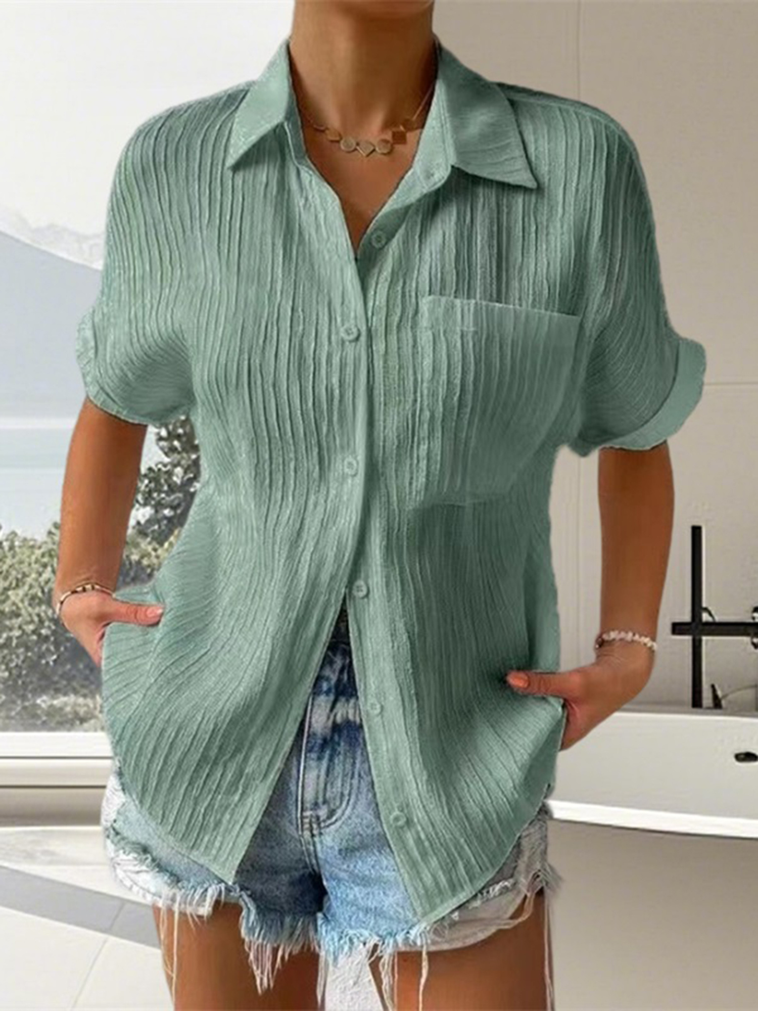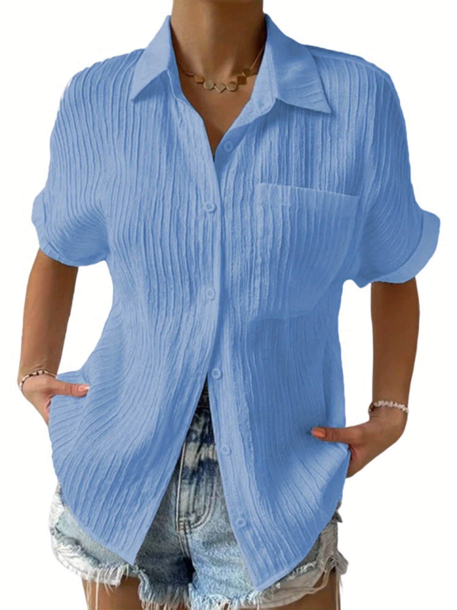 Women Short Sleeve Textured Shirts Solid Color Turn Collar Button Blouses Summer Loose Tops