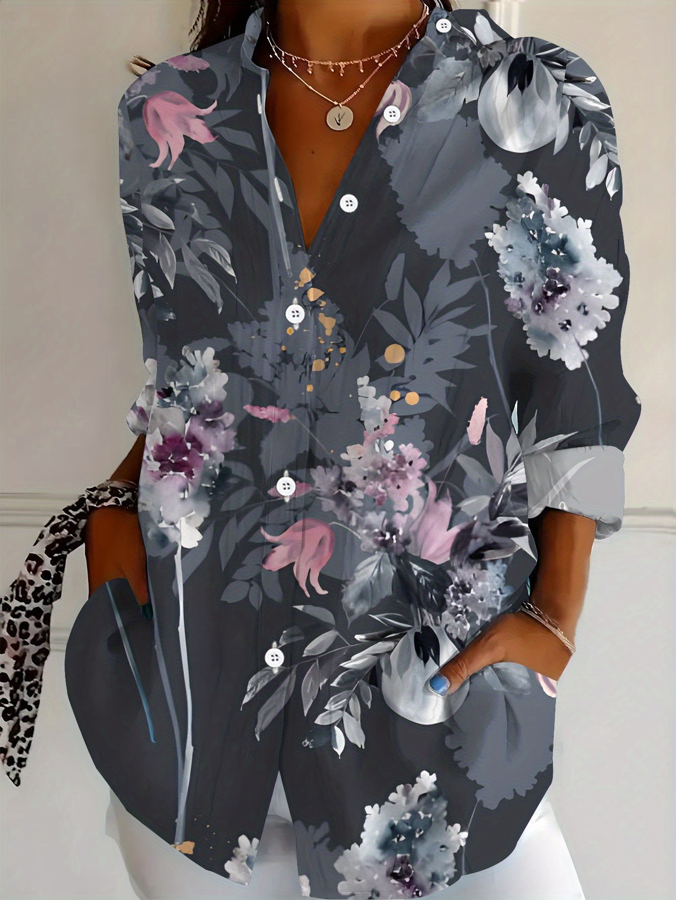Women'S Plus-Size Elegant Asian-Inspired Floral Print Long-Sleeve Lapel Collar Blouse - Soft Breathable Fabric, Waist-Cinching & Button-Up Top with Umbrella Hem, All-Season Casual & Formal Shirt in Deep Gray Tones (Pink/White/Black) - Perfect Christ