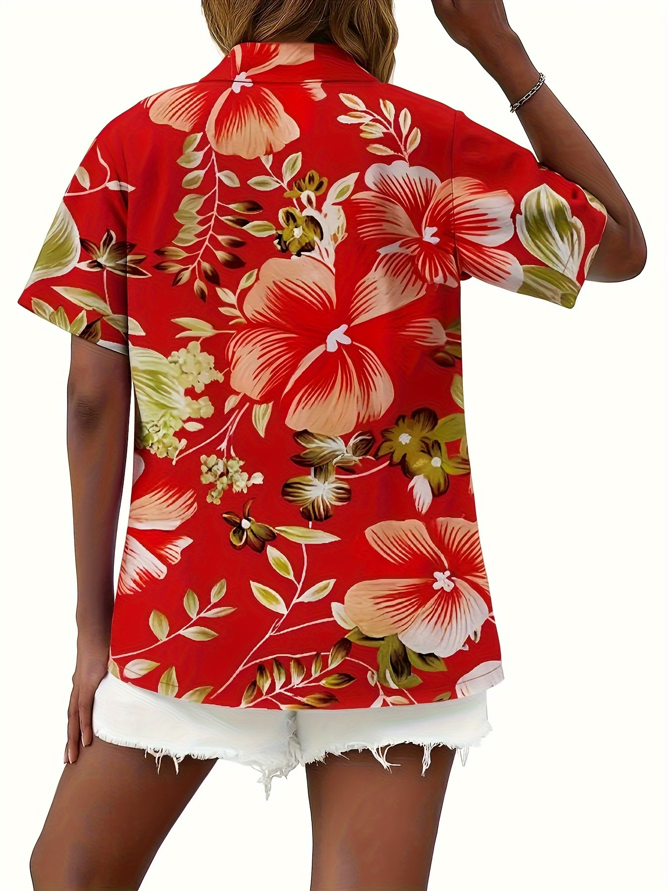 Women'S Tropical Floral Print Short Sleeve Button-Front Shirt - Vibrant Red with Orange, Green & White Hibiscus Flowers, Classic Collar, Machine Washable All-Season Casual & Hawaiian Style Blouse for Beach Outfits, Hawaiian Parties