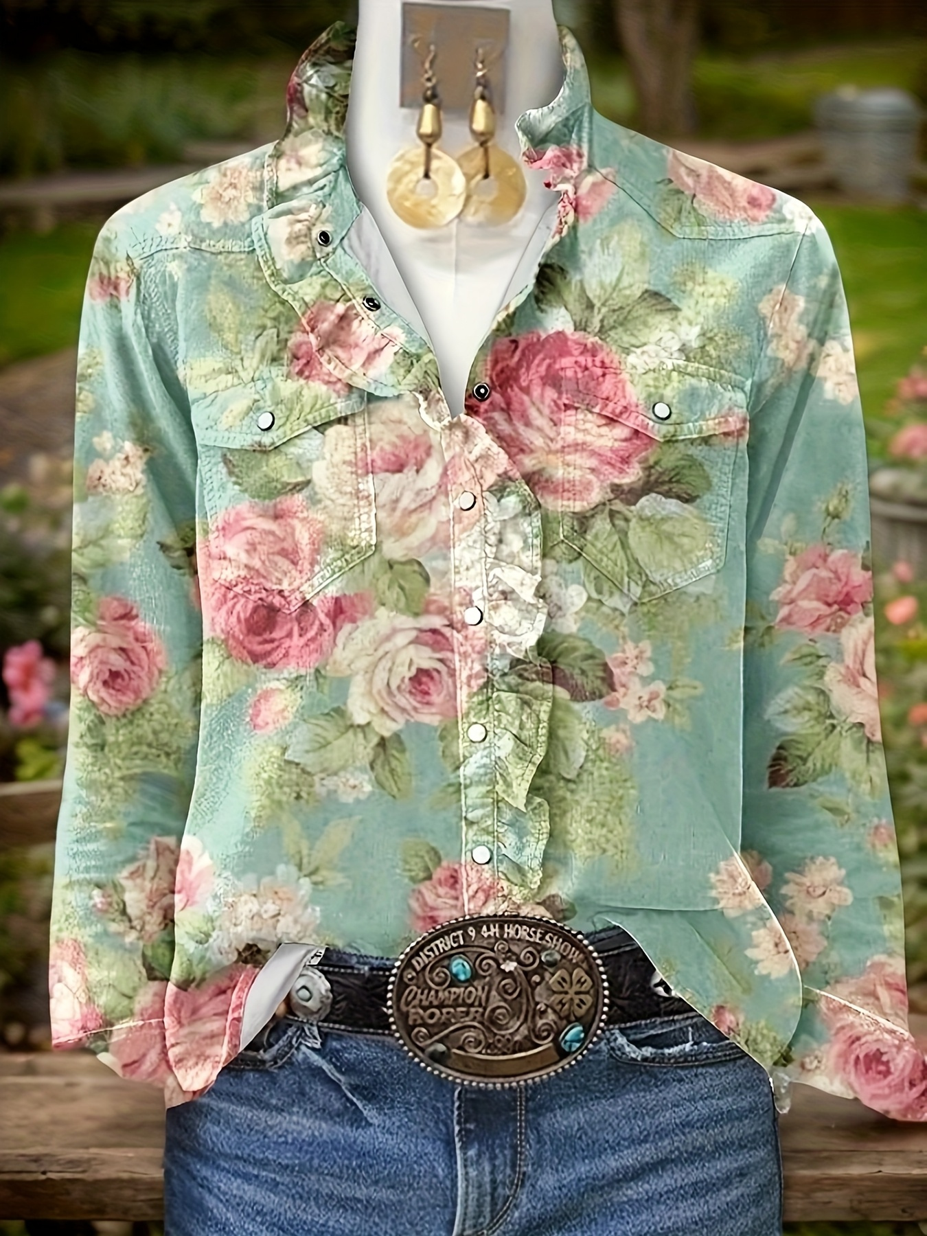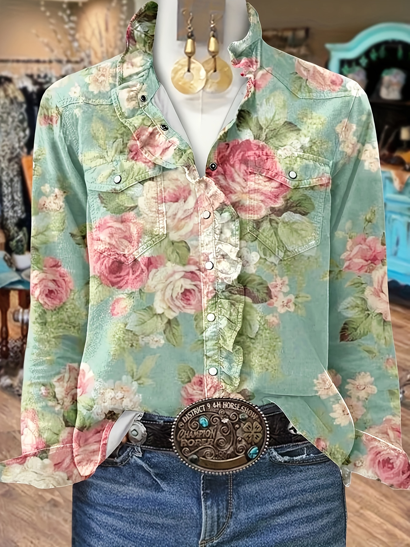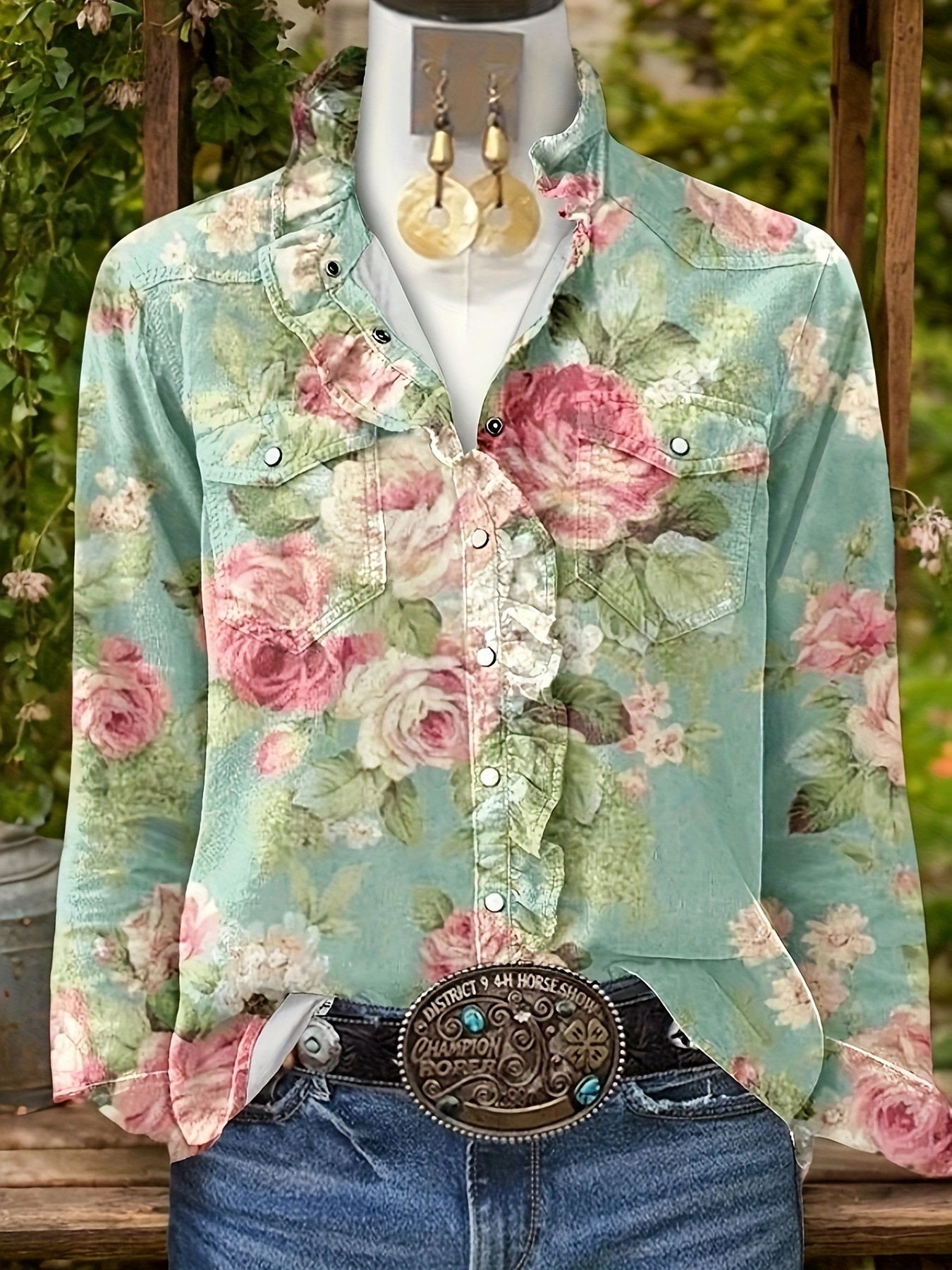 Women's Vintage Botanical Blouse with Ruffle Collar & Long Sleeves - Pink Rose & Green Foliage Print, Non-Sheer Regular Fit Shirt for Fall Winter, Casual or Dressy Outfits