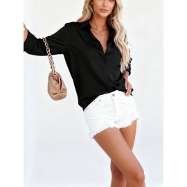 Women's Long Sleeve V-Neck Button Front Blouse - Solid Color Elegant Minimalist Shirt, Button- Collar Top for Office, Casual & Smart-Casual Wear, Spring/Autumn Daily Outfits (Hand Wash/Dry Clean) - Versatile Neutral Attire