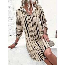 Striped Print Front Button Dress | Vintage 3/4 Sleeve Loose Shirt Dress, Elegant Lapel Collar, Suitable for Spring and Autumn, Women'S Clothing