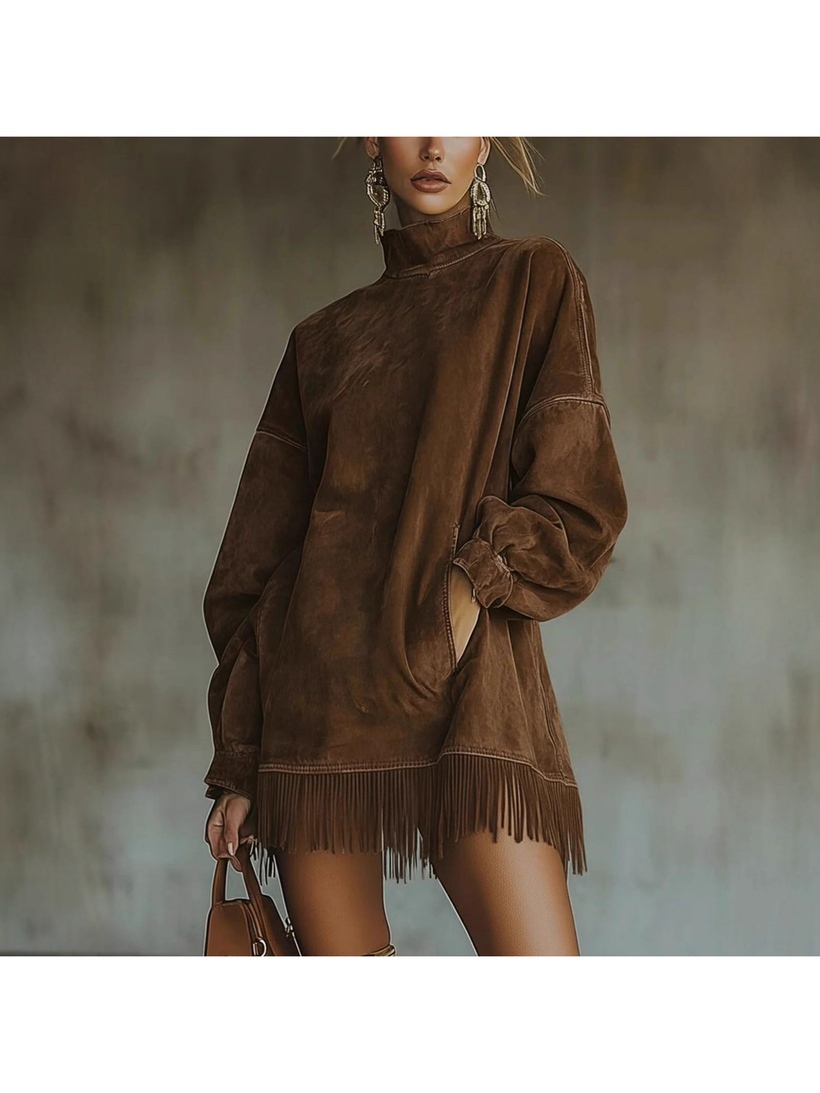 Bohemian Winter Dress with Suede Fringe Hem & Pockets - High Neck Long Sleeve Elegant Loose Fit Dress, 3D Tailored Silhouette for Weddings, Parties, Daily Wear - Machine Washable Autumn Dress