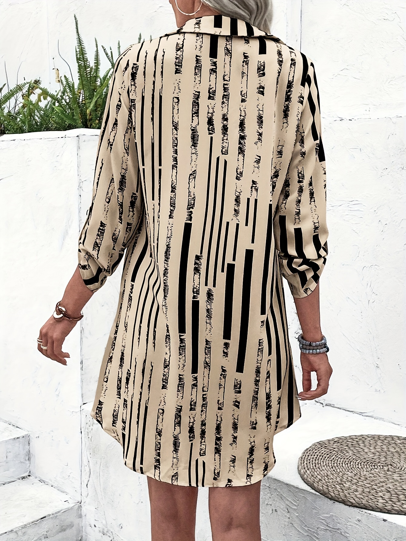 Striped Print Front Button Dress | Vintage 3/4 Sleeve Loose Shirt Dress, Elegant Lapel Collar, Suitable for Spring and Autumn, Women'S Clothing